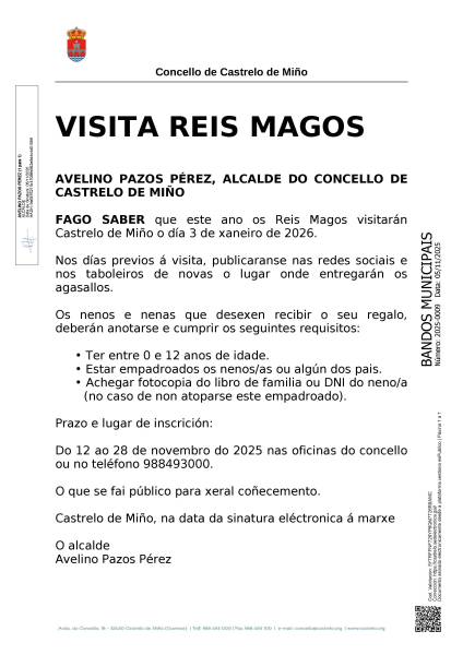 VISITA DOS REIS MAGOS: Os nenos e nenas que desexen recibir o seu regalo, deberán anotarse e cumprir os seguintes requisitos: -Ter entre 0 e 12 anos de idade. - Estar empadroados os nenos/as ou algún dos pais. - Achegar fotocopia do libro de familia ou DNI do neno/a (no caso de non atoparse este empadroado). Prazo e lugar de inscrición: Do 12 ao 28 de novembro do 2025 nas oficinas do concello ou no teléfono 988493000.